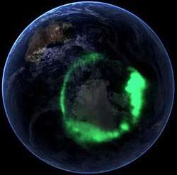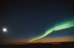 Auroras are most commonly observed in the "auroral zone",[12] a band approximately 6° (~660 km) wide in latitude centred on 67° north and south.[13] The region that currently displays an aurora is called the "auroral oval". The oval is displaced by the solar wind, pushing it about 15° away from the geomagnetic pole (not the geographic pole) in the noon direction and 23° away in the midnight direction.[13] The peak equatorward extent of the oval is displaced slightly from geographic midnight. It is centred about 3–5° nightward of the magnetic pole so that auroral arcs reach furthest toward the equator when the magnetic pole in question is in between the observer and the Sun, which is called magnetic midnight.