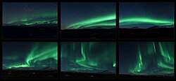 Auroras change with time. Over the night they begin with glows and progress toward coronas, although they may not reach them. They tend to fade in the opposite order.[27] Until about 1963, it was thought that these changes were due to the rotation of the Earth under a pattern fixed with respect to the Sun. Later, it was found by comparing all-sky films of auroras from different places (collected during the International Geophysical Year) that they often undergo global changes in a process called auroral substorm. They change in a few minutes from quiet arcs all along the auroral oval to active displays along the dark side and after 1–3 hours they gradually change back.[36] Changes in auroras over time are commonly visualized using keograms.[37]
