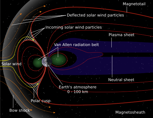 The details of these phenomena are not fully understood. However, it is clear that the prime source of auroral particles is the solar wind feeding the magnetosphere, the reservoir containing the radiation zones and temporarily magnetically trapped particles confined by the geomagnetic field, coupled with particle acceleration processes.[56]