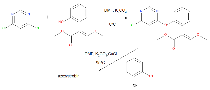 The first synthesis of azoxystrobin was disclosed in patents filed by the ICI group.[13] The sequence of the two substitution reactions allows for the synthesis of a diverse range of structural analogs via an Ullmann-type etherification between the aryl chloride of the first intermediate and a substituted phenol, thus introducing a range of structural diversity while maintaining the central strobin toxophore. The final choice of 2-cyano phenol in the second step of the synthesis was made after many other alternatives had been tested for their fungicidal properties.[9]: 704