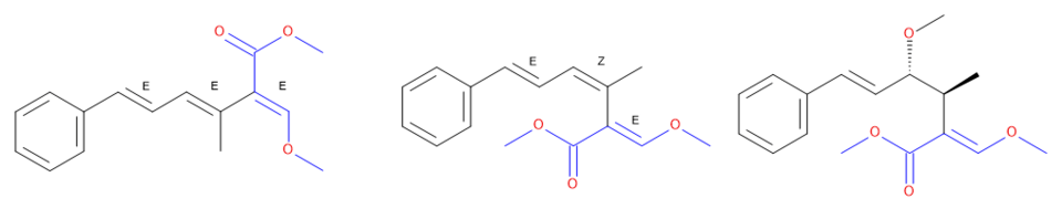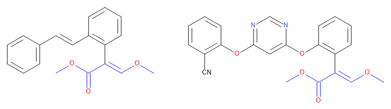 In 1977, academic research groups in Germany published details of two new antifungal antibiotics they had isolated from the basidiomycete fungus Strobilurus tenacellus. They named these strobilurin A and B but did not provide detailed structures, only data based on their high-resolution mass spectra, which showed that the simpler of the two had molecular formula C16H18O3.[4] In the following year, further details including structures were published[5] and a related fungicide, oudemansin A from the fungus Oudemansiella mucida, whose identity had been determined by X-ray crystallography, was disclosed.[6] When the fungicidal effects were shown to stem from what was then a novel mode of action,[7] chemists at the Imperial Chemical Industries (ICI) research site at Jealott's Hill became interested to use them as leads to develop new fungicides suitable for use in agriculture.[8] The first task was to synthesize a sample of strobilurin A for testing. In doing so, it was discovered that the structure that had been published was incorrect in the stereochemistry of one of the double bonds: the strobilurins, in fact, have the E,Z,E not E,E,E configuration. Once this was realised and the correct material was made and tested it was shown, as expected, to be active in vitro but insufficiently stable to light to be active in the glasshouse. A large programme of chemistry to make analogues was begun when it was discovered that a new stilbene structure containing the β-methoxyacrylate portion (shown in blue and believed to be the toxophore) had good activity in glasshouse tests but still lacked sufficient photostability.[9]: 695–696 After more than 1400 analogues had been made and tested the team chose azoxystrobin for commercialisation and it was developed under the code number ICIA5504.[10][11]