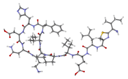 Bacitracin[1] is a polypeptide antibiotic. It is a mixture of related cyclic peptides produced by Bacillus licheniformis bacteria, that was first isolated from the variety "Tracy I" (ATCC 10716) in 1945.[2] These peptides disrupt Gram-positive bacteria by interfering with cell wall and peptidoglycan synthesis.