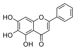 Baicalein (5,6,7-trihydroxyflavone) is a flavone, a type of flavonoid,[1] originally isolated from the roots of Scutellaria baicalensis and Scutellaria lateriflora. It is also a constituent of Oroxylum indicum (Indian trumpetflower) and thyme.[2] It is the aglycone of baicalin.