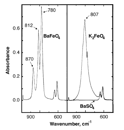 Infrared absorbance peaks of barium ferrate are observed at 870, 812, 780 cm−1.[6]