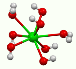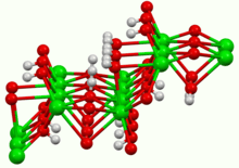 It crystallises as the octahydrate, which converts to the monohydrate upon heating in air. At 100 °C in a vacuum, the monohydrate will yield BaO and water.[3] The monohydrate adopts a layered structure (see picture above). The Ba2+ centers adopt a square antiprismatic geometry. Each Ba2+ center is bound by two water ligands and six hydroxide ligands, which are respectively doubly and triply bridging to neighboring Ba2+ centre sites.[4] In the octahydrate, the individual Ba2+ centers are again eight coordinate but do not share ligands.[5]