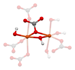 ![]() Ball-and-stick model of part of the crystal structure of malachite, highlighting the formula unit