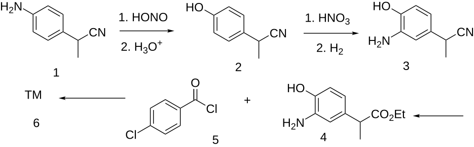 A Sandmeyer reaction by diazotisation of 2-(4-aminophenyl)propanenitrile (1) followed by acid hydrolysis leads to the phenol (2), which is nitrated and reduced by catalytic hydrogenation to give the aminophenol (3). Hydrolysis of the nitrile and esterification produces ester (4), which is converted to benoxaprofen by acylation with p-chlorobenzoyl chloride, followed by cyclisation and then saponification of the ethyl ester.[18][19][20]