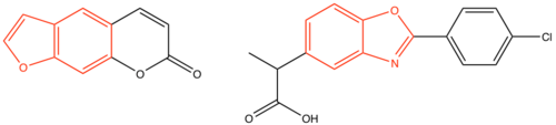 The structure of psoralen (left) and the structure of benoxaprofen (right); the benzofuran ring and the benoxazole ring are indicated in red.[4]