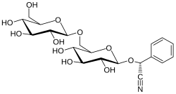 Almonds, apricot seeds, apple seeds, and cherry seed contain significant amounts of amygdalin. This glycoside breaks up under enzyme catalysis into benzaldehyde, hydrogen cyanide and two equivalents of glucose.