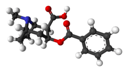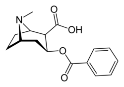 Chemically, benzoylecgonine is the benzoate ester of ecgonine. It is a primary metabolite of cocaine,[1] and is pharmacologically inactive.[2] It is the corresponding carboxylic acid of cocaine, its methyl ester. It is formed in the liver by the metabolism of cocaine by hydrolysis, catalysed by carboxylesterases, and subsequently excreted in the urine. It is readily synthesised by boiling cocaine freebase in water.[3]