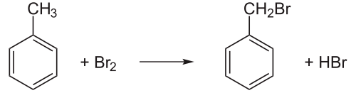 Benzyl bromide can be synthesized by the bromination of toluene under conditions suitable for a free radical halogenation: