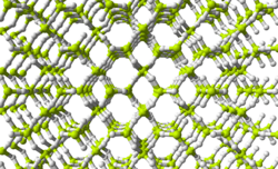Further synchrotron Powder X-ray diffraction studies of the higher-density phase of BeH2 have shown crystalline beryllium hydride to have a body-centered orthorhombic unit cell (space group Ibam), containing a network of corner-sharing BeH4 tetrahedra, in contrast to the flat, hydrogen-bridged, infinite chains previously thought to exist in crystalline BeH2.[2][9] The Be-H bond length is significantly shorter in for the orthorhomibic crystal shown than would be assumed in the hydrogen-bridged infinite chain model, with greater bond angles found in the BeH2 crystal structure compared to the 90° angles expected in the hydrogen-bridged model.[2] Before the structure was solved by synchrotron X-ray diffraction, it was thought that there was hydrogen-bridging.