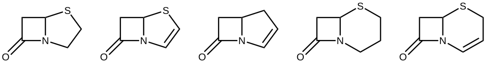 Core structures of some medicinally important beta-lactams. From left to right: penam, penem, carbapenem, cepham, and cephem.