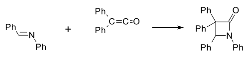 The first synthetic β-lactam was prepared by Hermann Staudinger in 1907 by reaction of the Schiff base of aniline and benzaldehyde with diphenylketene[8][9] in a [2+2] cycloaddition (Ph indicates a phenyl functional group):