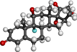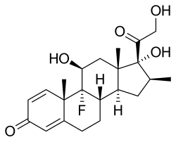 Betamethasone is a steroid medication.[3] It is used for a number of diseases including rheumatic disorders such as rheumatoid arthritis and systemic lupus erythematosus, skin diseases such as dermatitis and psoriasis, allergic conditions such as asthma and angioedema, preterm labor to speed the development of the baby's lungs, Crohn's disease, cancers such as leukemia, and along with fludrocortisone for adrenocortical insufficiency, among others.[3] It can be taken by mouth, injected into a muscle, or applied to the skin, typically in cream, lotion, or liquid forms.[3][4]