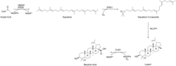 Saccharomyces cerevisiae has been engineered to produce betulinic acid from the mevalonate pathway, with squalene 2,3-epoxide as an intermediate. Acetyl-CoA is converted to squalene through use of the 3-hydroxyl-3-methylglutaryl-CoA reductase (HMGR) and the bifunctional farnesyl-diphosphate farnesyltransferase and squalene synthase (ERG9) and oxidation of NADPH to NADP+. This is then further oxygenated by the squalene monooxygenase (ERG1) to squalene 2,3-epoxide. This is cyclized to lupeol by the Arabidopsis thaliana lupeol synthase (AtLUP1). Finally, lupeol is converted to betulinic acid through the Catharanthus roseus P450 monooxygenase (CrAO) with the oxidation of NADPH to NADP+.[18]