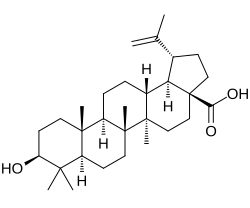 Betulinic acid is a naturally occurring pentacyclic triterpenoid which has antiretroviral, antimalarial, and anti-inflammatory properties, as well as a more recently discovered potential as an anticancer agent, by inhibition of topoisomerase.[1] It is found in the bark of several species of plants, principally the white birch (Betula pubescens)[2] from which it gets its name, same as the bracket fungus Fomitopsis betulina, but also the ber tree (Ziziphus mauritiana), selfheal (Prunella vulgaris), the tropical carnivorous plants Triphyophyllum peltatum and Ancistrocladus heyneanus, Diospyros leucomelas, a member of the persimmon family, Tetracera boiviniana, the jambul (Syzygium formosanum),[3] flowering quince (Pseudocydonia sinensis, former Chaenomeles sinensis KOEHNE),[4] rosemary,[5] and Pulsatilla chinensis.[6]