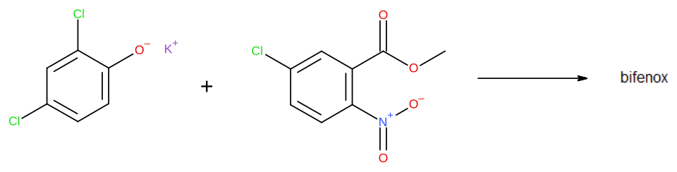 The preparation of bifenox first described in the Mobil patent includes as its final step an Ullmann condensation between the potassium salt of 2,4-dichlorophenol and methyl 2-nitro-5-chlorobenzoic acid.[7][10]: 43