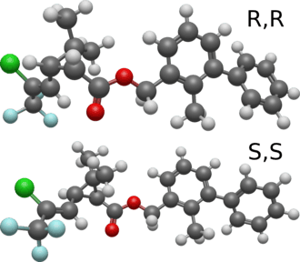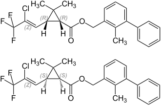 Like other pyrethroids, bifenthrin is chiral; it has different enantiomers which can have different effects. Bifenthrin is found in two enantiomers: 1S-cis-bifenthrin and 1R-cis-bifenthrin. 1S-cis-Bifenthrin is 3-4 times more toxic to humans than 1R-cis-bifenthrin, while the latter is more than 300 times more effective as a pesticide.[2]