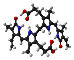Bilirubin consists of an open-chain tetrapyrrole. It is formed by oxidative cleavage of a porphyrin in heme, which affords biliverdin. Biliverdin is reduced to bilirubin. After conjugation with glucuronic acid, bilirubin is water-soluble and can be excreted.[5]