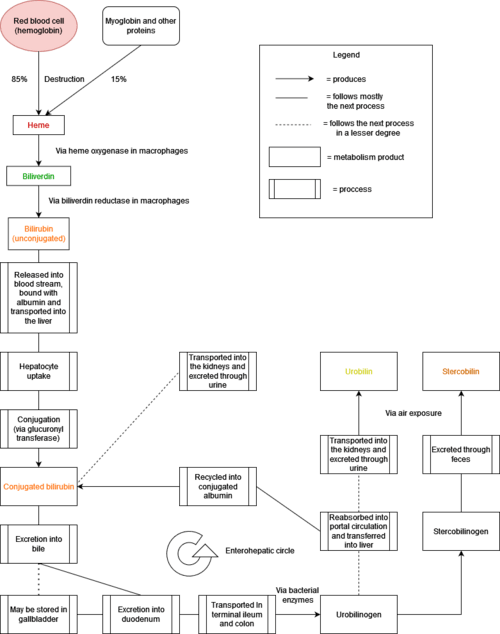 - ^ a b Kalakonda A, John S (2019). "Physiology, Bilirubin article-18281". StatPearls. Treasure Island (FL): StatPearls Publishing. PMID 29261920. Retrieved 22 December 2019.