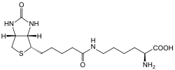 Biocytin is a chemical compound that is an amide formed from the vitamin biotin and the amino acid L-lysine. As an intermediate in the metabolism of biotin, biocytin occurs naturally in blood serum and urine.