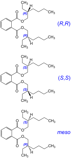DEHP has two stereocenters,[8] located at the carbon atoms carrying the ethyl groups. As a result, it has three distinct stereoisomers,[8] consisting of an (R,R) form, an (S,S) form (diastereomers), and a meso (R, S) form. As most 2-ethylhexanol is produced as a racemic mixture, commercially-produced DEHP is therefore racemic as well, and consists of a 1:1:2 statistical mixture of stereoisomers.