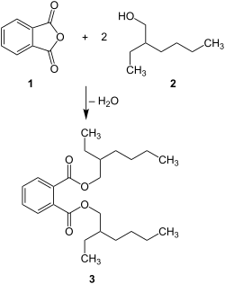 Di(2-ethylhexyl) phthalate is produced commercially by the reaction of excess 2-ethylhexanol with phthalic anhydride in the presence of an acid catalyst such as sulfuric acid or para-toluenesulfonic acid. It was first produced in commercial quantities in Japan circa 1933 and in the United States in 1939.[7]