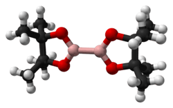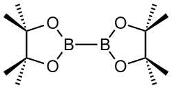 Bis(pinacolato)diboron is a covalent compound containing two boron atoms and two pinacolato ligands. It has the formula [(CH3)4C2O2B]2; the pinacol groups are sometimes abbreviated as "pin", so the structure is sometimes represented as B2pin2. It is a colourless solid that is soluble in organic solvents. It is a commercially available reagent for making pinacol boronic esters for organic synthesis. Unlike some other diboron compounds, B2pin2 is not moisture-sensitive and can be handled in air.[1]