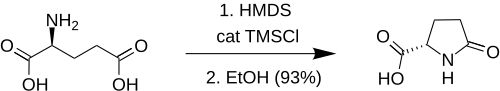 Silylation of glutamic acid with excess hexamethyldisilazane and catalytic TMSCl in either refluxing xylene or acetonitrile followed by dilution with alcohol (methanol or ethanol) yields the derived lactam pyroglutamic acid in good yield.