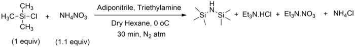 - 2 (CH3)3SiCl + 3 NH3 → [(CH3)3Si]2NH + 2 NH4Cl