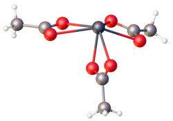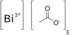 Bismuth(III) acetate is the coordination complex with the formula Bi(O2CCH3)3. It is a molecular compound featuring Bi bound to six oxygen ligands in a distorted polyhedral sphere. According to X-ray crystallography, the acetate ligands are bound very unsymmetrically such that three Bi-O bonds are approximately 2.3 Å in length, and three others are near 2.6 Å. The stereochemically active lone pair of electrons occupies significant portion of the coordination sphere.[1] The compound has been further characterized by solid-state NMR spectroscopy.[2]