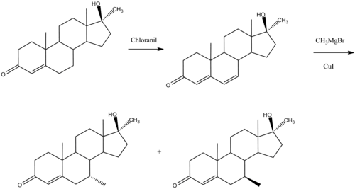 The oxidation of methyltestosterone [58-18-4] (1 ) with chloranil gives 17alpha-methyl-6,7-dehydrotestosterone [5585-85-3] (2 ). The conjugate addition of methylmagnesium bromide in the presence of a catalytic amount of cuprous iodide (c.f. Gilman reagent) gives a mixture of bolasterone and calusterone , with the former predominating.