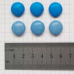 Brilliant blue FCF (Blue 1) is a synthetic organic compound used primarily as a blue colorant for processed foods, medications, dietary supplements, and cosmetics.[1] It is classified as a triarylmethane dye and is known under various names, such as FD&C Blue No. 1 or acid blue 9. It is denoted by E number E133 and has a color index of 42090. It has the appearance of a blue powder and is soluble in water and glycerol,[2] with a maximum absorption at about 628 nanometers.[3] It is one of the oldest FDA-approved color additives, having been permanently listed for use in food and ingested drugs in 1969. It is generally considered nontoxic and safe for consumption.[4][5][6]