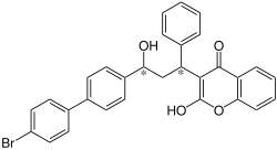 The compound is used as a mixture of four stereoisomers. Its two stereoisomeric centers are at the phenyl- and the hydroxyl-substituted carbons in the carbon chain of the substituent at the 3 position of the coumarin.