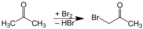Bromoacetone is prepared by combining bromine and acetone,[4] with catalytic acid. As with all ketones, acetone enolizes in the presence of acids or bases. The alpha carbon then undergoes electrophilic substitution with bromine. The main difficulty with this method is over-bromination, resulting in di- and tribrominated products. If a base is present, bromoform is obtained instead, by the haloform reaction.[5]