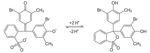 Similar to bromocresol green, the structure of bromocresol purple changes with pH. Changing the level of acidity causes a shift in the equilibrium between two different structures that have different colors. In near-neutral or alkaline solution, the chemical has a sulfonate structure that gives the solution a purple color. As the pH decreases, it converts to a sultone (cyclic sulfonic ester) that colors the solution yellow. In some microbiology tests, this change is used as an indicator of bacterial growth.[9][10]