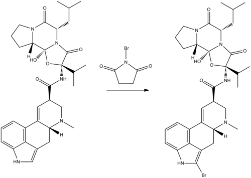 Bromocriptine is a semisynthetic derivative of a natural ergot alkaloid, ergocryptine (a derivative of lysergic acid), which is synthesized by bromination of ergocryptine using N-bromosuccinimide.[37][38]