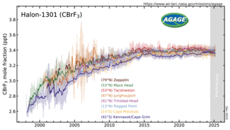 H-1301 measured by the Advanced Global Atmospheric Gases Experiment (AGAGE) in the lower atmosphere (troposphere) at stations around the world. Abundances are given as pollution free monthly mean mole fractions in parts-per-trillion.