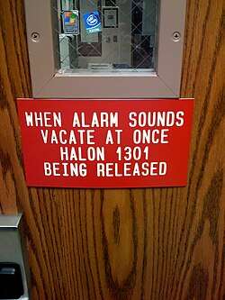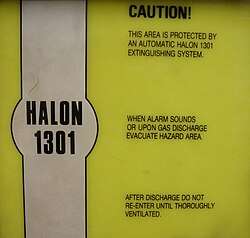 Halon 1301 hazard sign, with instructions upon gas discharge.