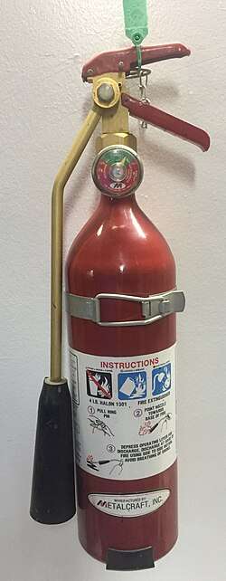 Halon 1301 was developed in a joint venture between the U.S. Army and Purdue University in the late 1940's,[5] and became a DuPont product in 1954. It was introduced as an effective gaseous fire suppression fixed systems agent in the 1960s, and was used around valuable materials, such as aircraft, mainframe computers, and telecommunication switching centers, usually in total flooding systems.[6] It was also widely used in the maritime industry to add a third level of protection should the main and emergency fire pumps become inoperable or ineffective. Halon 1301 was never widely used in portables outside marine, military and spacecraft applications, due to its limited range, and invisible discharge. It does not produce the characteristic white cloud like CO2 and is difficult to direct when fighting large fires. Halon 1301 is ideal for armored vehicles and spacecraft, because it produces fewer toxic by-products than does Halon 1211, which is critical for combat or space conditions where a compartment may not be able to be ventilated immediately. Halon 1301 is widely used by the U.S. Military[7] and NASA in a 2-3/4 lb portable extinguisher with a sealed, disposable cylinder for quick recharging. Other agents such as CO2 and FE-36 (HFC-236fa) wet chemical are largely replacing halon 1301 for environmental concerns. Civilian models in 2-3/4, 3, and 4 lb sizes were also made.