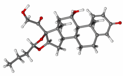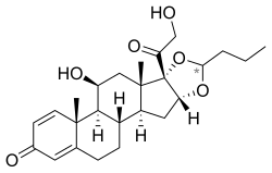 Budesonide, also known as 11β,21-dihydroxy-16α,17α-(butylidenebis(oxy))pregna-1,4-diene-3,20-dione, is a synthetic pregnane steroid and non-halogenated cyclic ketal corticosteroid.[49][50] It is the C16α hydroxyl, C16α,17α cyclic ketal with butyraldehyde derivative of prednisolone (11β,17α,21-trihydroxypregna-1,4-diene-3,20-dione).[49][50]