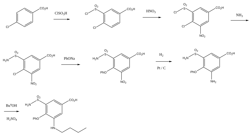 Bumetanide is synthesized from 4-chlorobenzoic acid.[12][13][14][15] In the first stage of synthesis, it undergoes sulfonylchlorination by chlorosulfonic acid, forming 4-chloro-3-chlorosulfonylbenzoic acid, which is further nitrated with nitric acid to 4-chloro-3-chlorosulfonyl-5-nitrobenzoic acid. Reacting this with ammonia gives 5-aminosulfonyl-4-chloro-3-nitrobenzoic acid, which when reacted with sodium phenolate is transformed into 5-amino-sulfonyl-3-nitro-5-phenoxybenzoic acid. Reduction of the nitro group in this product by hydrogen using a palladium on carbon catalyst gives 3-amino-5-aminosulfonyl-5-phenoxybenzoic acid. Finally, reacting this with butyl alcohol in the presence of sulfuric acid, followed by treatment with sodium hydroxide to hydrolyze the butyl ester, gives the desired bumetanide.
