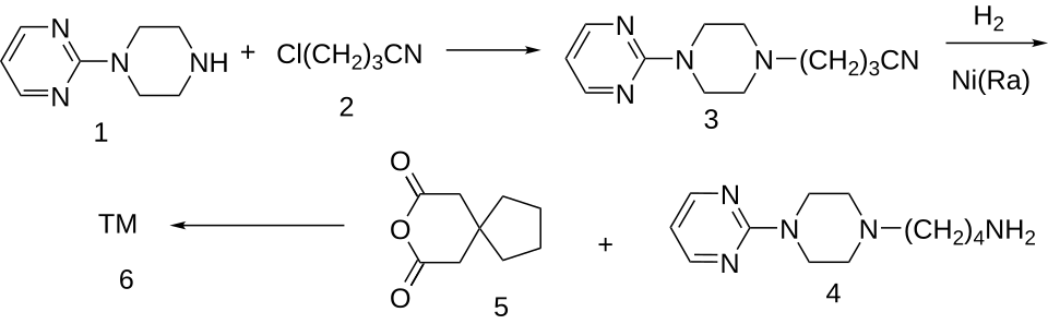 - ^ Mou J, Zong ZM, Wei XY (August 2008). "Facile Synthesis of Anxiolytic Buspirone". Organic Preparations and Procedures International. 40 (4): 391–394. doi:10.1080/00304940809458099. eISSN 1945-5453. ISSN 0030-4948. S2CID 95124245.