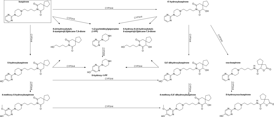 - ^ a b c d Zhu M, Zhao W, Jimenez H, Zhang D, Yeola S, Dai R, et al. (April 2005). "Cytochrome P450 3A-mediated metabolism of buspirone in human liver microsomes". Drug Metabolism and Disposition. 33 (4): 500–507. doi:10.1124/dmd.104.000836. PMID 15640381. S2CID 10142905.