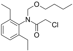 Butachlor is a herbicide of the acetanilide class.[3] It is used as a selective pre-emergent herbicide[1] to control annual grasses and some broad-leaved weeds. It was introduced circa 1970.[4] It is extensively used in India in the form of granules and emulsifiable concentrate in rice as post emergence herbicide, and 2,699 tonnes (5,950,000 lb) was sold in India in 2005-06, declining to 372 tonnes (820,000 lb) in 2009-10.[5]