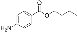 It is the ester of 4-aminobenzoic acid and butanol.[1] A white, odourless, crystalline powder. that is mildly soluble in water (1 part in 7000) and soluble in alcohol, ether, chloroform, fixed oils, and dilute acids. It slowly hydrolyses when boiled with water. Synonyms include Butamben, Butilaminobenzoato, and Butoforme.