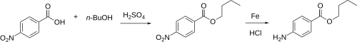The Fischer esterification of 4-Nitrobenzoic acid [62-23-7] (1) and 1-Butanol [71-36-3] (2) gives n-Butyl 4-Nitrobenzoate [120-48-9] (3). Bechamp reduction then gives Butamben (4).