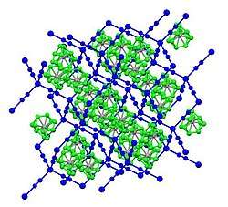 Cadmium cyanide and zinc cyanide adopt similar structures.[4] As such, each metal has tetrahedral coordination sphere. Cyanide ligands interconnect pairs of metal centers. Two of the resulting diamondoid structures are interpenetrated. The structure is related to that of cristobalite, a polymorphs of SiO2. This structural similarity of cadmium dicyanide and cristobalite was foundational in the development of mineralomimetic chemistry: "the build-up of mineral-like structures using materials that never give stable minerals."[5]