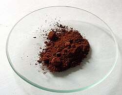 Cadmium oxide is an inorganic compound with the formula CdO. It is one of the main precursors to other cadmium compounds. It crystallizes in a cubic rocksalt lattice like sodium chloride, with octahedral cation and anion centers.[11] It occurs naturally as the rare mineral monteponite. Cadmium oxide can be found as a colorless amorphous powder or as brown or red crystals.[12] Cadmium oxide is an n-type semiconductor[13] with a band gap of 2.18 eV (2.31 eV) at room temperature (298 K).[14]